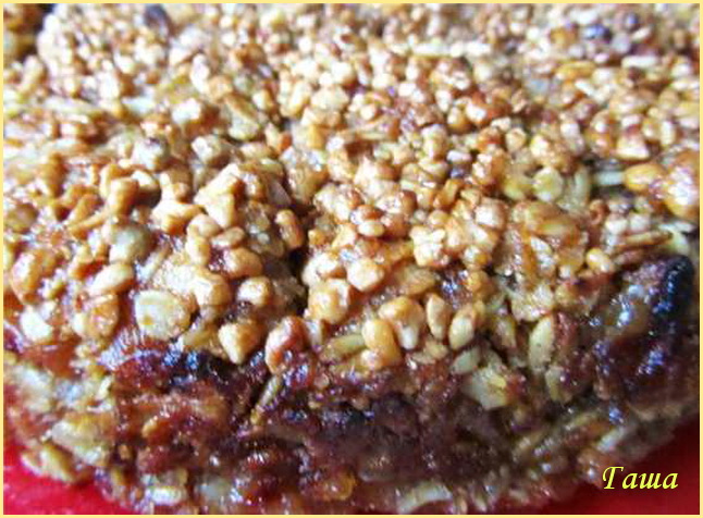 6. Орехи (в оригинале - грецкие, я брала арахис) порубить ножом, посыпать пирог и выпекать при 190 град.С минут 25.