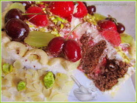 Теперь надо срезать нитки и обмазать весь торт кремом. Обсыпать боковые стенки торта миндальными лепестками или другими орешками, а верх торта украсить клубникой или другими ягодами, которые рекомендуется смазать потом желе или сиропом, или вареньем, чтобы избежать прокисания